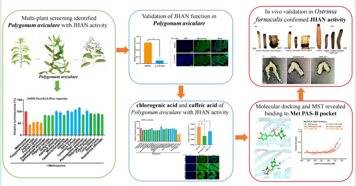 随着化学杀虫剂引起的环境污染和害虫抗药性问题日益严重,开发绿色、可持续的杀虫剂成为当务之急。保幼激素拮抗剂(Juvenile hormone antagonists, JHANs)通过干扰昆虫的生长发育和繁殖过程,以及对脊椎动物的毒性低,展现出良好的应用前景。本研究通过在果蝇Kc细胞中利用保幼激素响应区(JHRR)驱动的荧光素酶报告系统,对多种植物粗提物进行高通量筛选,发现中药植物萹蓄(Polygonum aviculare)提取物具有显著的JHAN活性。进一步活性成分分析,鉴定出绿原酸(chlorogenic acid)和咖啡酸(caffeic acid)为主要的保幼激素拮抗剂成分。