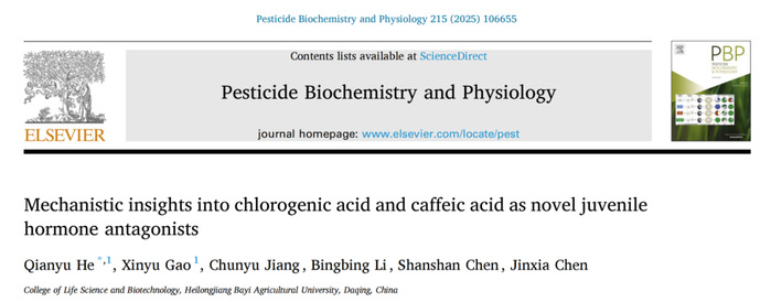 近日,由我院何倩毓副教授指导的2023级生物与医药专业硕士研究生高新宇在2025年8月于中科院一区TOP期刊《 Pesticide Biochemistry and Physiology》发表题为“Mechanistic insights into chlorogenic acid and caffeic acid as novel juvenile hormone antagonists”的研究论文。该研究旨在从植物中筛选高效的保幼激素拮抗剂,并阐明其作用机制。