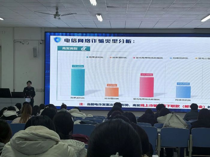 讲座伊始,民警结合当前诈骗高发态势,以生动有趣的互动问答环节切入,引导同学们初步建立对电信诈骗的认知,迅速点燃参与热情。随后,民警通过PPT展示、数据解读与真实案例剖析相结合的方式,系统梳理了“刷单返利”“冒充客服退款”“虚假网络贷款”“冒充电商物流客服”等10余种常见诈骗类型,特别针对大学生防范意识薄弱的特点,拆解了骗子利用“小恩小惠诱惑”“紧急氛围施压”“信任关系渗透”等手段逐步突破受害者心理防线的套路,还原了高校学生因刷单被套取学费、轻信虚假兼职陷入连环诈骗的真实场景,让在场师生直观感受到诈骗的隐蔽性与危害性。