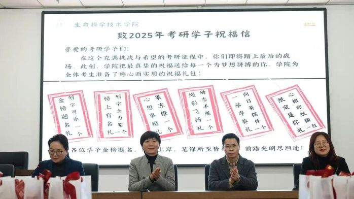 考研攻坚在即,为给怀揣梦想的考研学子加油鼓劲、传递真挚关怀与坚定支持,生命科学技术学院于12月15日下午开展了2026届本科生考研慰问活动,学院党委书记范文艳、院长晏磊、党委副书记梁平、副院长王艳红出席活动,为考研学子鼓舞士气,传递力量,做好温馨提示和诚信教育。