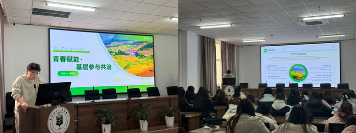 第二位进行分享的是张明洋同学,他围绕“青春赋能·基层参与共治”展开分享,聚焦寒假期间深入基层的实践经历。在基层实践中,他参与了数据整理、政策宣传等工作,通过与群众的深入交流,他体会到“基层是最好的课堂”,鼓励同学们在实践中锤炼本领,将个人成长融入国家发展大局。