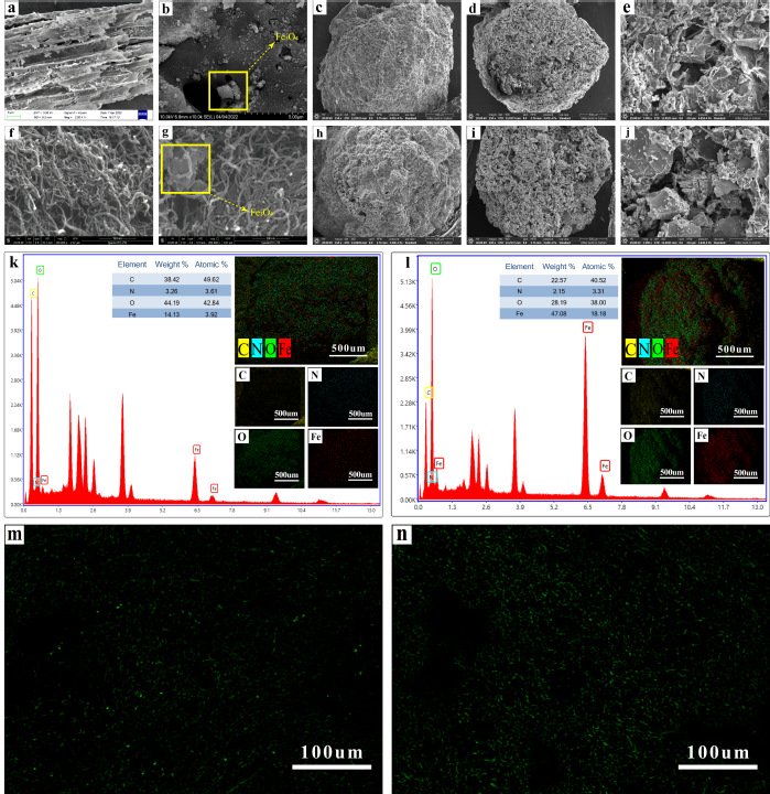 Fig. 1. Characterization of magnetic beads and fluorescence staining of LD23 bacteria in: (a, b) MRHC, (c–e) MRHC-MS, (f, g) MCNT, (h–j) MCNT-MS, (k,m) MRHCMS and (l,n) MCNT-MS.