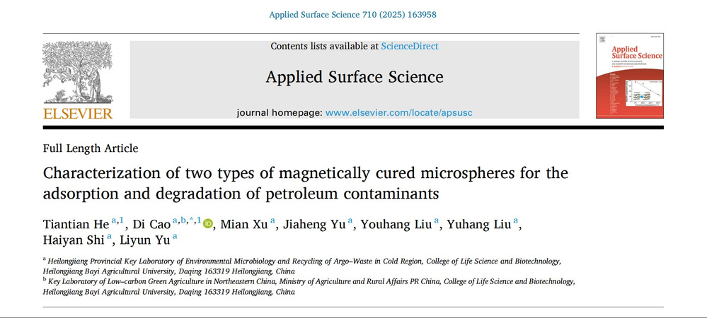 近日,由我院曹迪副教授指导的2024级微生物方向硕士研究生何恬田在2025年7月发表一篇中科院二区期刊《Applied Surface Science》(IF:6.9)的研究论文,题目为“Characterization of two types of magnetically cured microspheres for the adsorption and degradation of petroleum contaminants”,该研究系统的解析了磁性稻壳微球和磁性碳纳米管微球对石油吸附和降解的机制及其影响因素。