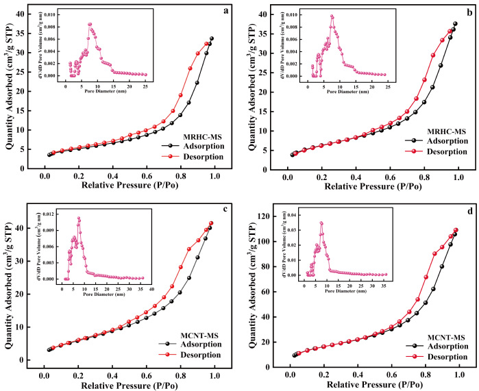 Fig. 2. The N2 adsorption − desorption isotherms and pore size distribution of the two types of microspheres: (a) MRHC-MS without bacterial embedding, (b) MRHCMS with bacterial embedding, (c) MCNT-MS without bacterial embedding, and (d) MCNT-MS with bacterial embedding