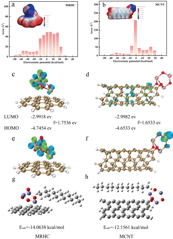 Fig. 4. Electrostatic potential, LUMO-HOMO and adsorption configuration: (a-b) electrostatic potential analysis, (c-f) frontier molecular orbital LUMO-HOMO and (g-h) adsorption configuration and adsorption energy.
